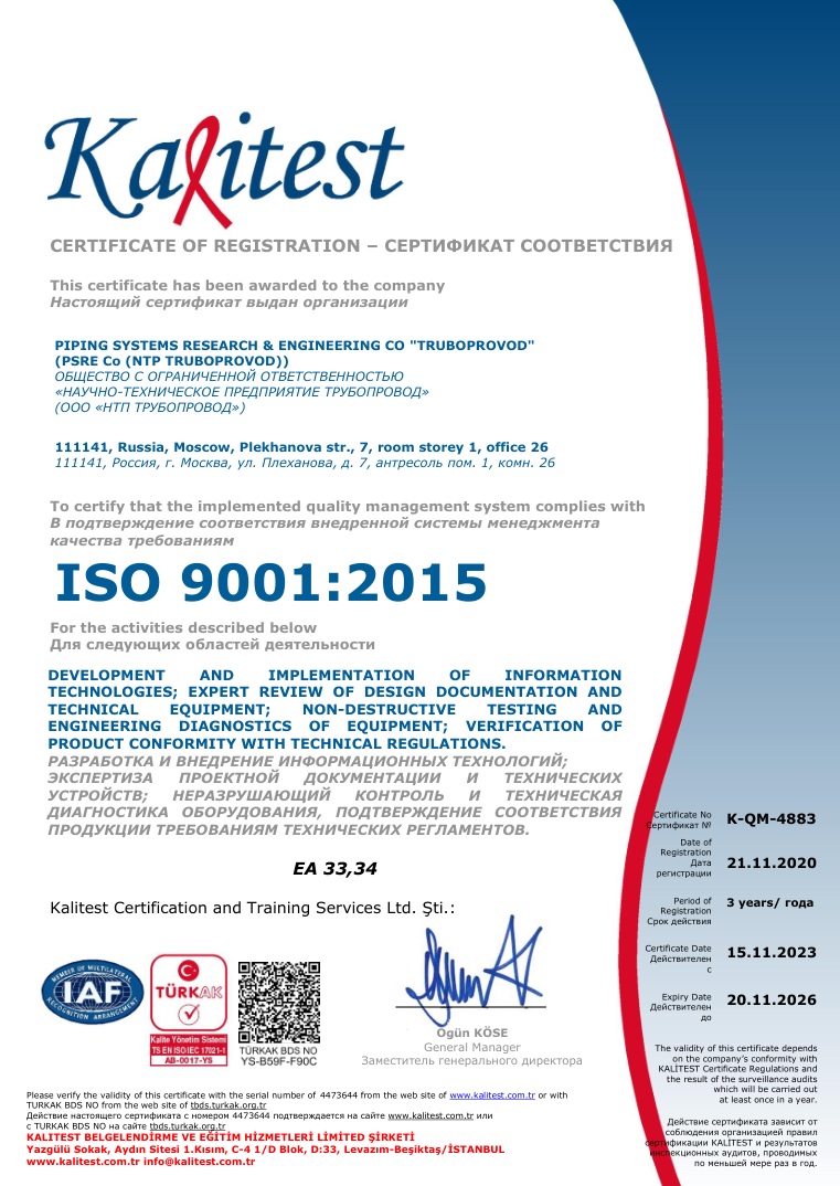 В 2008 г. впервые прошел сертификационный аудит, в результате которого нами были получены сертификаты соответствия ISO 9001 и ГОСТ Р ИСО 9001. В АО «ИПН» и ООО «НТП Трубопровод» каждые три года проводится ре-сертификационный аудит, а ежегодно проводится внешний инспекционный аудит.