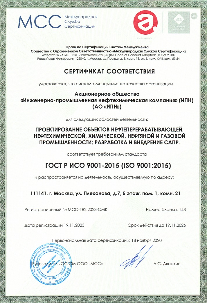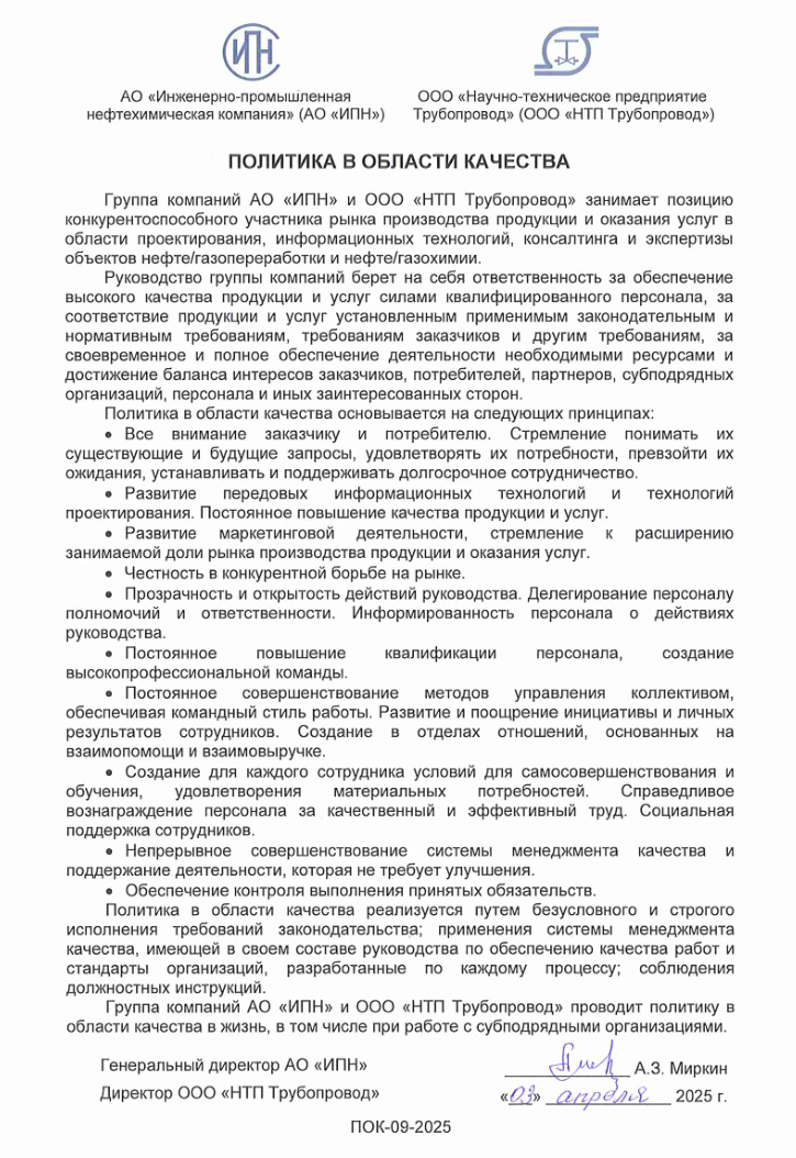 В группе компаний АО «ИПН» и ООО «НТП Трубопровод» функционирует система менеджмента качества в соответствии с международным стандартом ISO 9001:2015, а также ГОСТ Р ИСО 9001-2015.