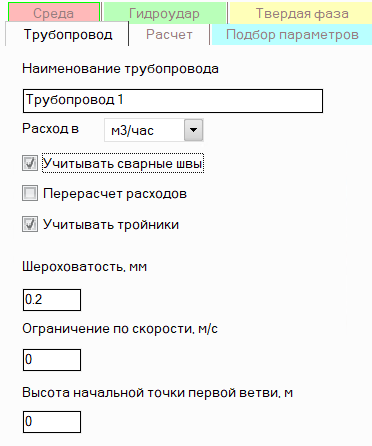 - Для удобства ввода исходных данных вкладки и поля с параметрами, необходимыми для выполнения только каких-то определенных видов расчетов, отмечены в интерфейсе программы разными цветами: красным – параметры, использующиеся только при тепловом расчете трубопровода, зеленым – при расчете гидроудара, желтым – при расчете течений, содержащих твердую фазу, голубым – при расчете с подбором параметров (подбор регуляторов давлений, расходов и т.д.).